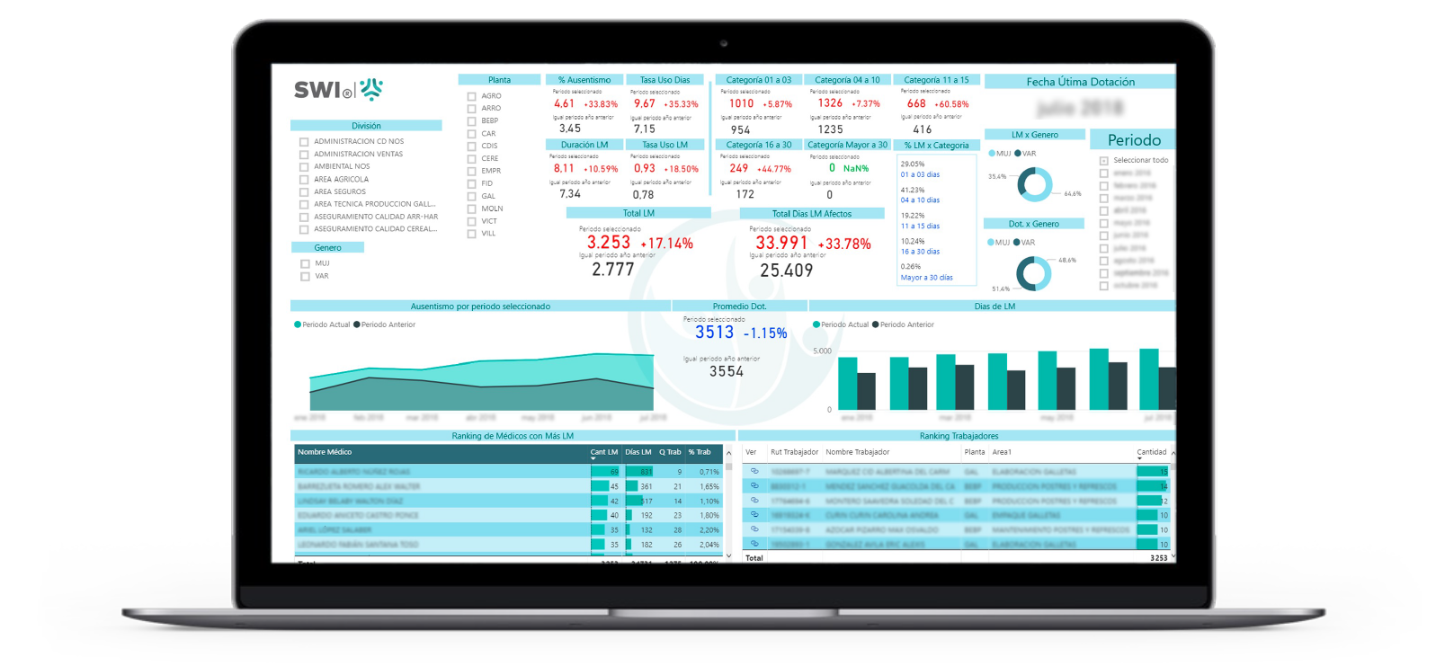 SWI ® es la plataforma donde integramos toda la información del ausentismo en tu empresa para que la visualices en 25 paneles simples y fáciles de entender.